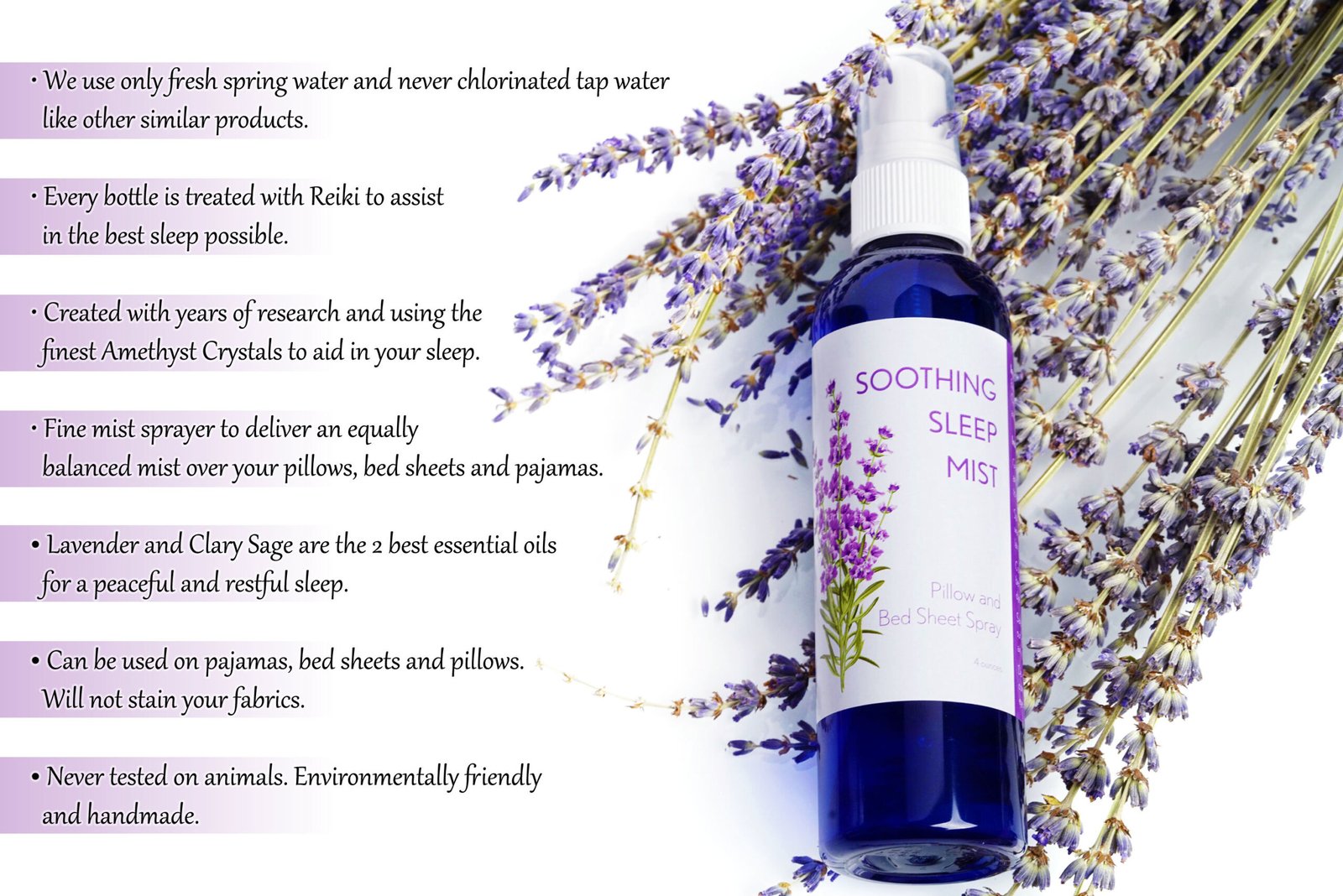 1.Lavender Linen Spray For Sheets: Our hand-crafted Soothing Sleep Mist contains beneficial Lavender based and complimenting Essential Oils, Amethyst crystals and is Reiki treated for your best nights sleep ever.